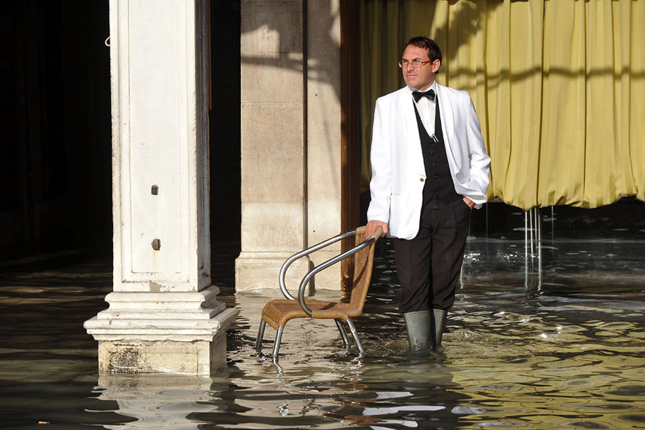 圖為一名穿著雨靴的服務生站在圣馬可廣場上。