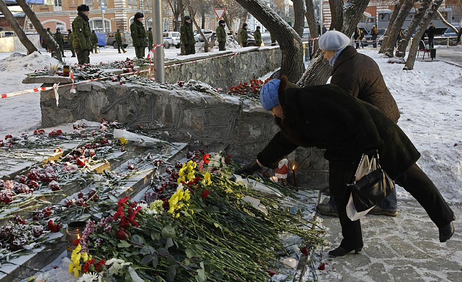 12月6日,在俄羅斯彼爾姆邊疆區(qū)首府彼爾姆市,人們?cè)谝箍倳?huì)火災(zāi)事故現(xiàn)場(chǎng)附近哀悼遇難者。圖片來源:中國新聞網(wǎng)