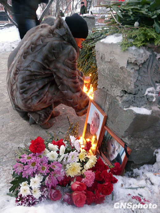 十二月六日,在俄羅斯彼爾姆市夜總會火災事故現場,一位俄羅斯婦女點燃蠟燭,悼念自己的親人。中新社發 田冰 攝