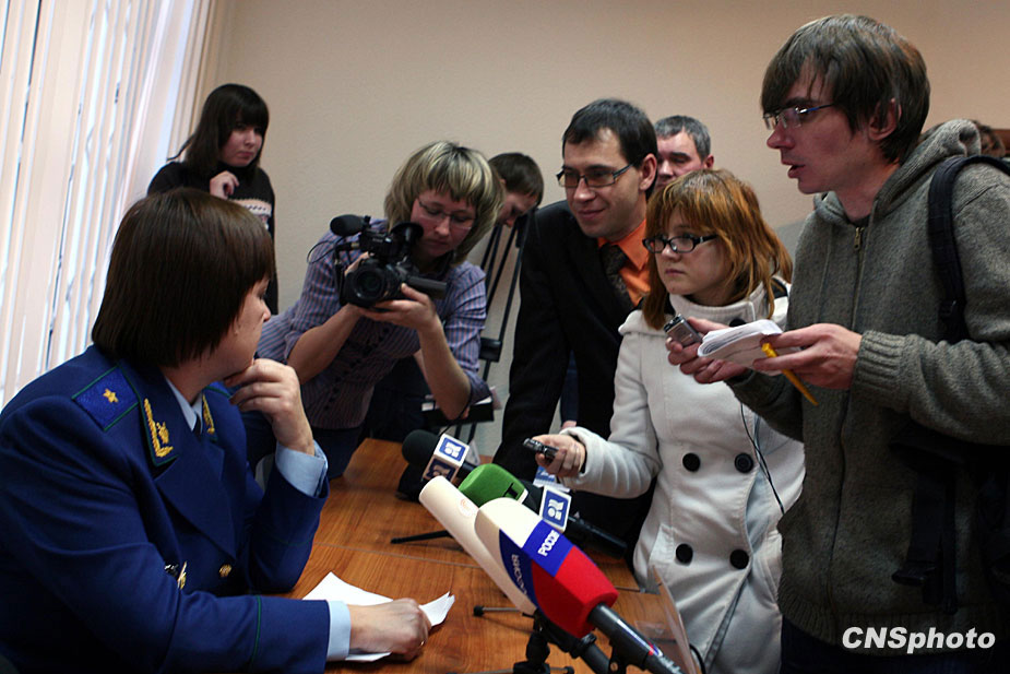 十二月六日,俄羅斯彼爾姆市夜總會火災事故的第二天,調查委員會負責人在舉行新聞發布會時遭到聚集在此的數十家媒體記者的“圍堵”發問。中新社發 田冰 攝