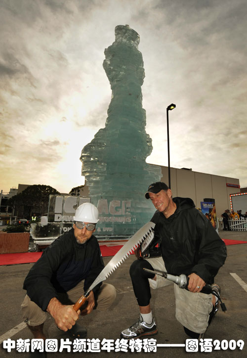 世界最高冰雕:10月27日,美國圣莫尼卡一座造型為《冰河世紀:恐龍的黎明》中小松鼠的巨型冰雕聳立在廣場上。這座冰雕高約48英尺,打破了法國人06年創下的高度為40.28英尺的吉尼斯紀錄,成為世界上最高的冰雕。圖片來源:中國新聞網