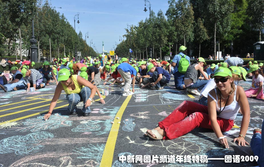 最多參加的粉筆畫:9月20日,世界無車日,在匈牙利首都布達佩斯的一條街道上5317人同時參加粉筆畫制作,打破了以前的吉尼斯世界紀錄。圖片來源:中國新聞網