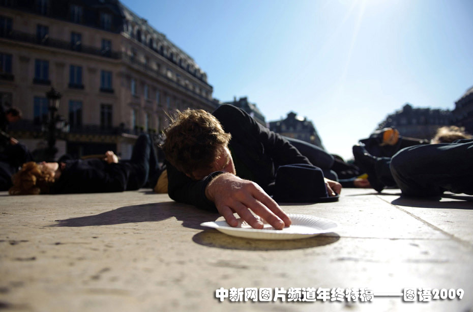 10月15日,示威者身穿黑色衣服、手持空盤子在巴黎歌劇院前抗議。他們此舉是為了呼吁人們關注世界上的饑民。