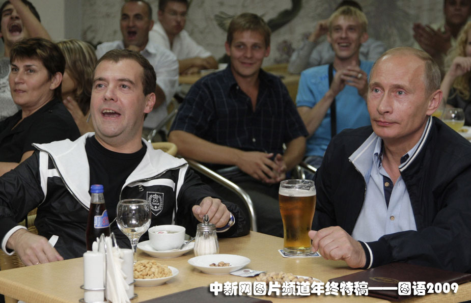 兄弟同樂:2009年8月12日,俄羅斯總統梅德韋杰夫、總理普京在一家咖啡廳里觀看了俄羅斯與阿根廷足球友誼賽的電視直播。