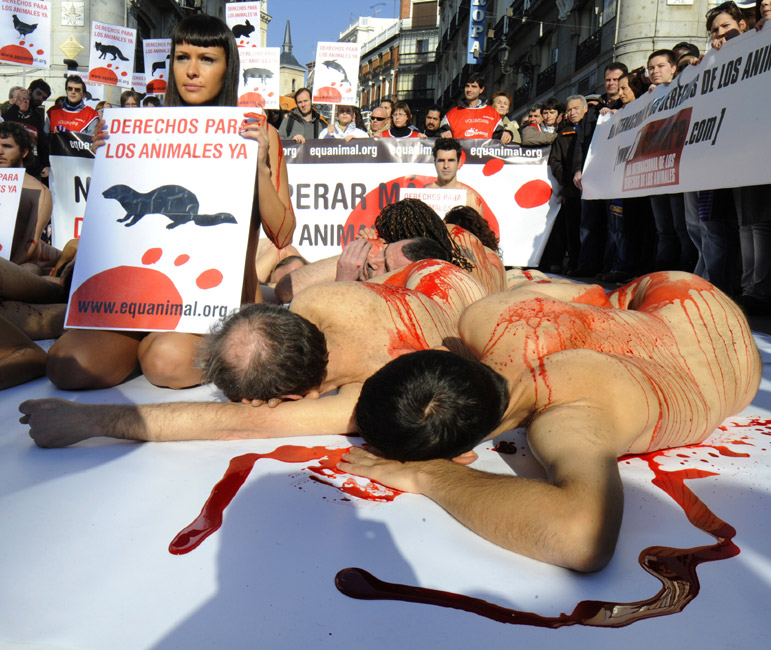 12月12日,動(dòng)物保護(hù)組織的活動(dòng)者在身上涂上紅色顏料,赤身裸體地躺在西班牙馬德里的街道上,抗議捕殺海豹。