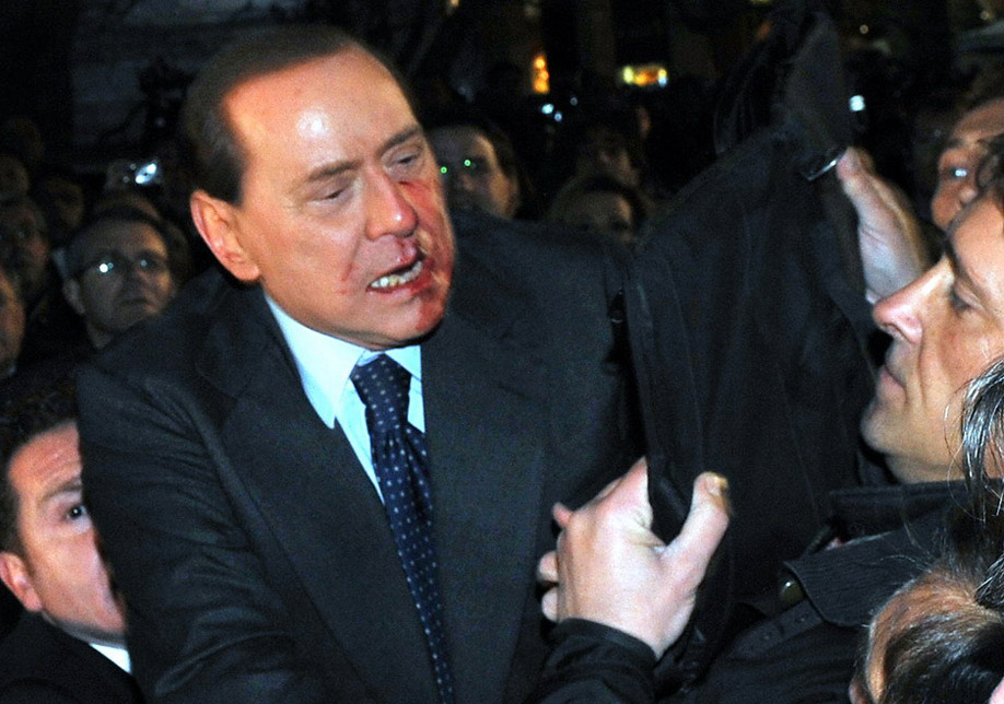 時值政治盟友沖刺階段,貝盧斯科尼照例參加自己黨派的集會。就在他給支持者簽名時,人群中一名中年男子突然毆打其面部。當地電視臺畫面顯示,跌倒在地的貝盧斯科尼被助手扶起時,口鼻出血,面部淤青,表情痛苦。
