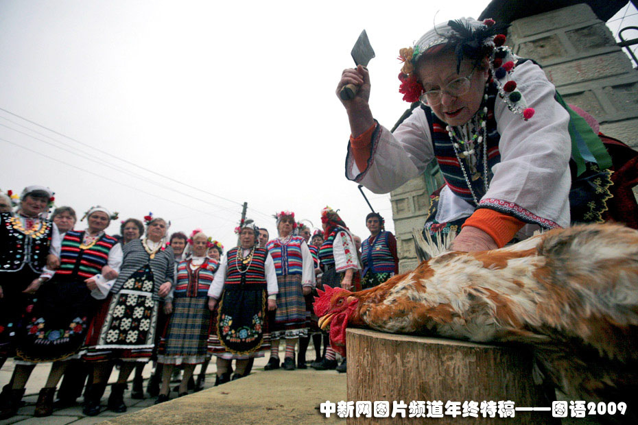 保加利亞“公雞節”——保加利亞首都索非亞東部一個村莊2月2日慶祝“公雞節”,當地婦女手舉穿著褲子的公雞又唱又跳,之后宰殺公雞作為祭祀貢品。當地慶祝該節意在為家中男孩祈求健康。