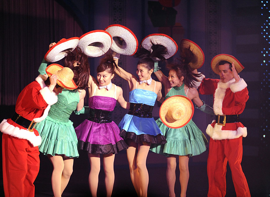 12月19日,在日本東京一家劇院,身著圣誕老人服裝的退役的奧運(yùn)會選手參加“肌肉音樂劇”預(yù)演,展示其過人的身體素質(zhì)與運(yùn)動技巧。圖片來源:中國新聞網(wǎng)
