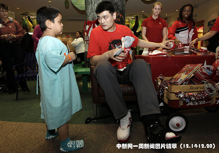 14日(周一),美國休斯敦,姚明和幾位休斯敦火箭的隊友來到一家兒童醫院看望患兒,并為孩子們送去禮物。圖片來源:中國新聞網