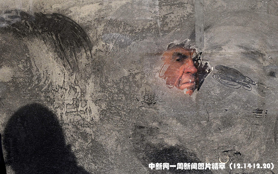 15日(周二),烏克蘭首都基輔的氣溫降至攝氏零下16度,圖為一名男子在公交車上透過結冰的車窗往外看。圖片來源:中國新聞網