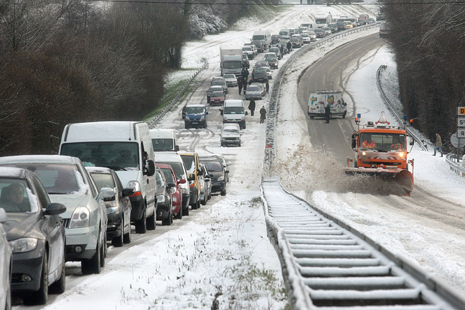 圖為12月18日,大雪導致法國圣約瑟夫地區出現嚴重堵車。