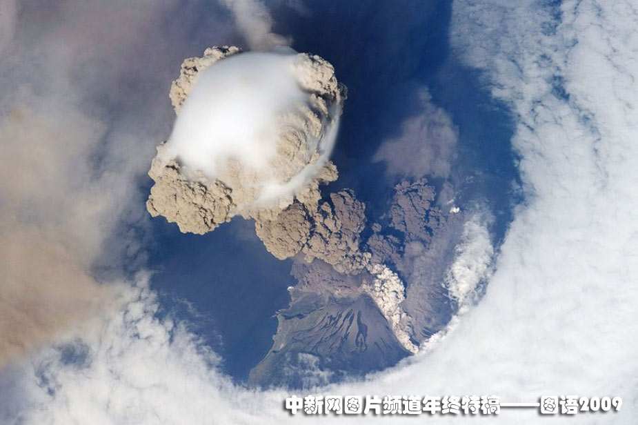 2009年6月12日,國際空間站拍到千島群島上的Sarychev火山爆發初期的景象。