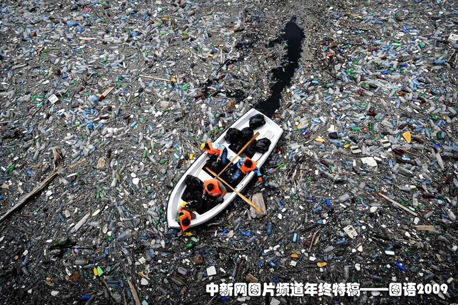 2009年4月25日,保加利亞志愿者們正在努力清理已經快要堵塞的瓦哈大壩,那里到處都是的塑料瓶還有其他垃圾。