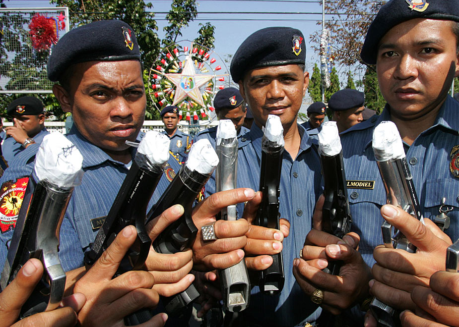 12月29日,菲律賓首都南部的塔吉格市警察部隊為了防止警務人員在慶祝新年時胡亂開槍,下令用膠紙把槍口封起來。圖片來源:中國新聞網