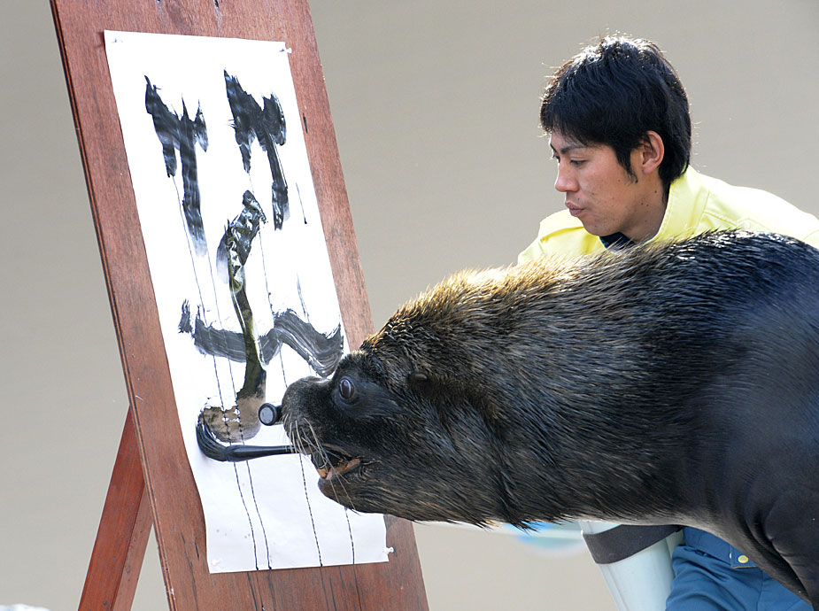 12月30日,日本神奈川八景島海洋樂園水族館內,海獅表演了用毛筆在紙上“寫”漢字的節目。圖片來源:中國新聞網