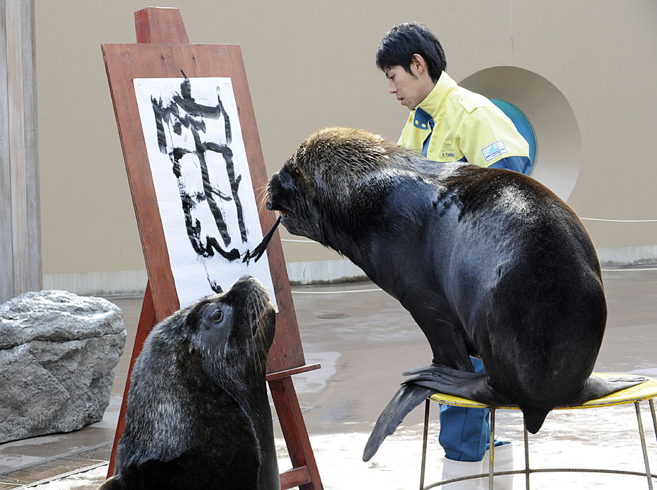 12月30日,日本神奈川八景島海洋樂園水族館內,海獅表演了用毛筆在紙上“寫”漢字的節目。圖片來源:中國新聞網