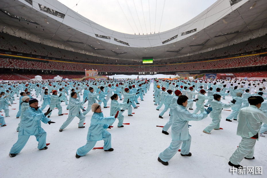 2010年1月1日上午,2010人在被冰雪覆蓋的鳥巢內表演了太極拳、武功扇等民族傳統健身項目。中新網記者 金碩 攝