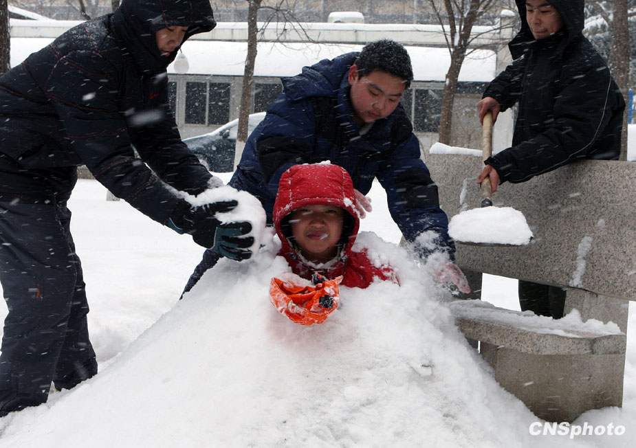 1月3日,幾名不畏嚴寒的中學生在雪中制作“活雪人”,樂在其中。中新社發 任晨鳴 攝
