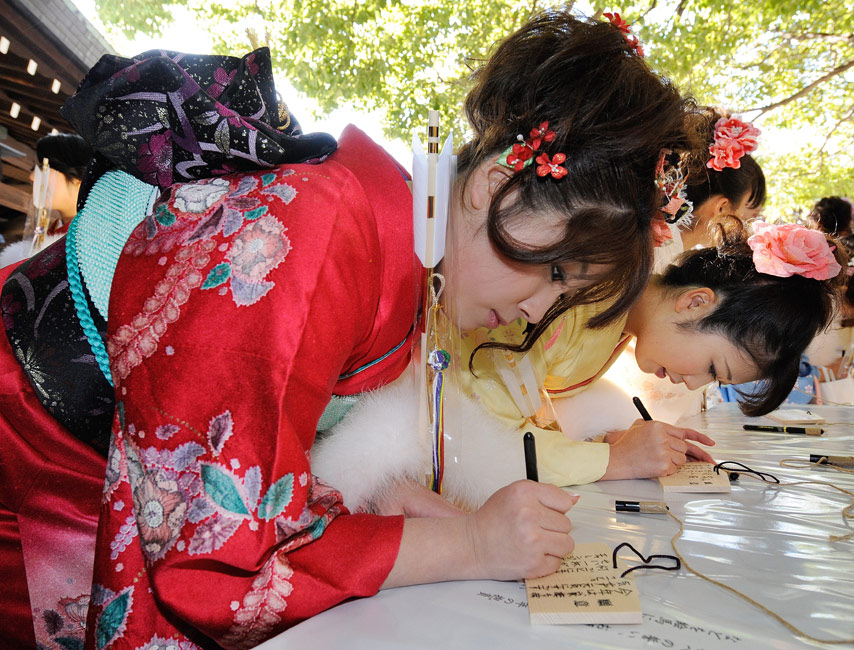 日本年輕女孩穿和服祈福迎接成人節