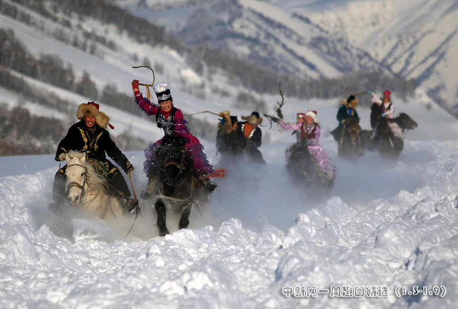 新年伊始,新疆布爾津縣喀納斯景區哈薩克族牧民在雪中表演傳統節目——姑娘追。圖片來源:中國新聞網>>點擊觀看詳細內容