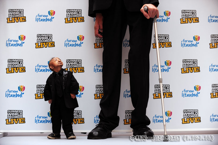 1月14日,土耳其伊斯坦布爾,“世界最矮人”何平平和“世界最高人”土耳其人科森(Sultan Kosen)出席吉尼斯世界紀錄路演。圖片來源:中國新聞網>>點擊觀看詳細內容