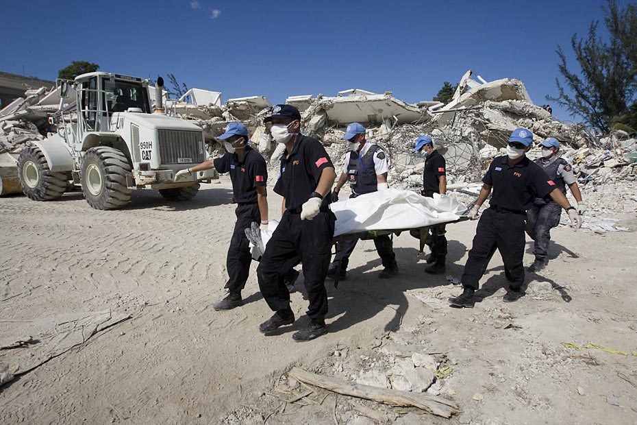 1月16日,海地首都太子港,中國國際救援隊(duì)在聯(lián)海團(tuán)總部對遇難者進(jìn)行搜尋工作。此前八名中方失蹤人員的遺體已全被找到。圖片來源:中國新聞網(wǎng)