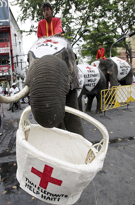 1月21日,在泰國首都曼谷舉辦了一場大象為海地災區募捐活動。人們紛紛向大象攜帶的籃子內放入善款,向海地地震幸存者獻上一份愛心。圖片來源:中國新聞網