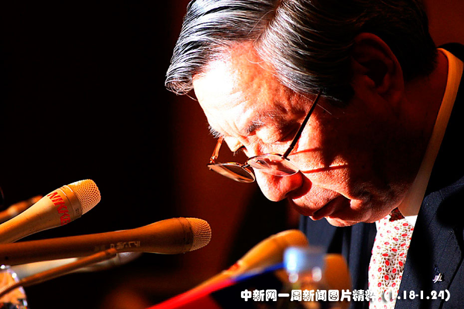 1月19日,負債256億美元的日本航空公司申請破產保護。圖為日航總裁西松遙當天在東京為公司破產鞠躬致歉,并宣布辭職。圖片來源:中國新聞網