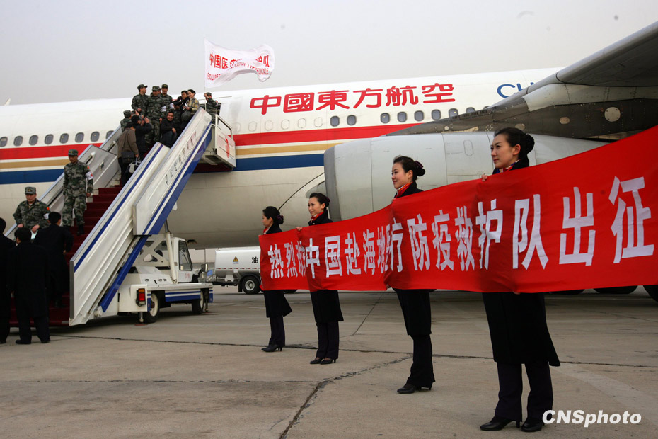 1月24日18時(shí),由中國人民解放軍醫(yī)護(hù)人員和管理人員組成的中國醫(yī)療防疫救護(hù)隊(duì)一行40人乘坐軍運(yùn)包機(jī)離開北京,啟程前往海地進(jìn)行人道主義救援任務(wù)。