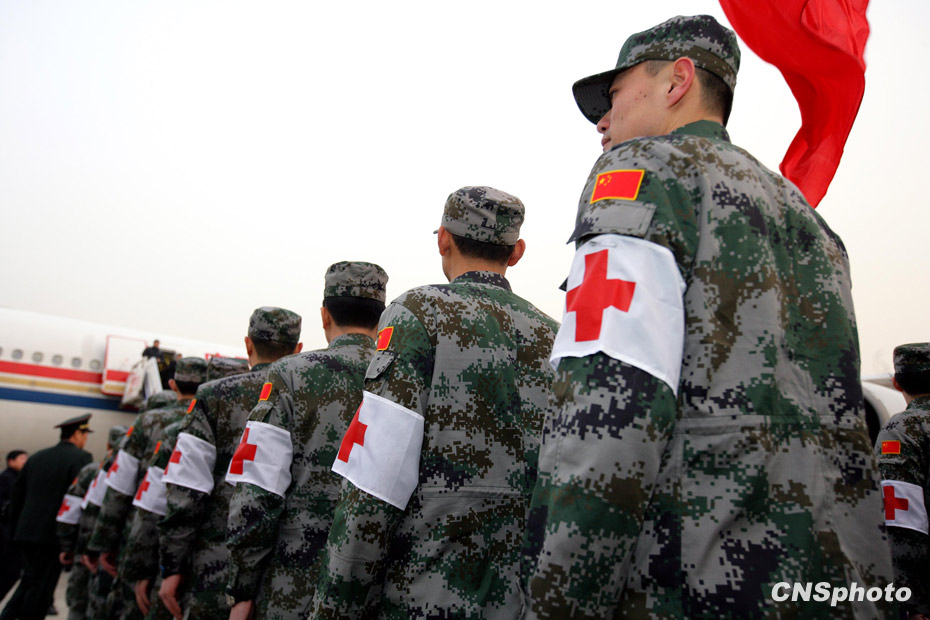 中國人民解放軍醫護人員和管理人員組成的中國醫療防疫救護隊一行40人乘坐軍運包機離開北京,啟程前往海地進行人道主義救援任務。中新社發 劉震 攝