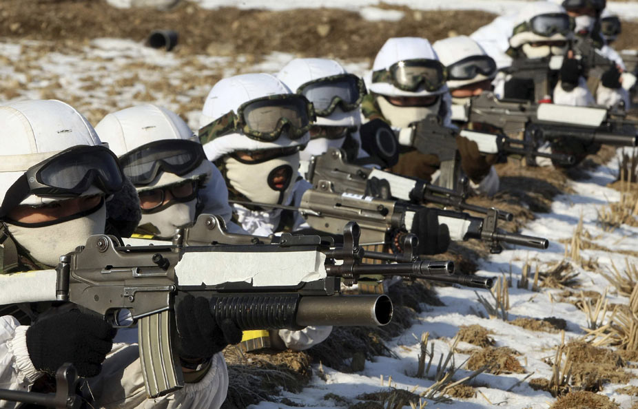 1月27日,韓國(guó)江原道,韓國(guó)陸軍部隊(duì)在嚴(yán)寒中進(jìn)行戰(zhàn)術(shù)訓(xùn)練。