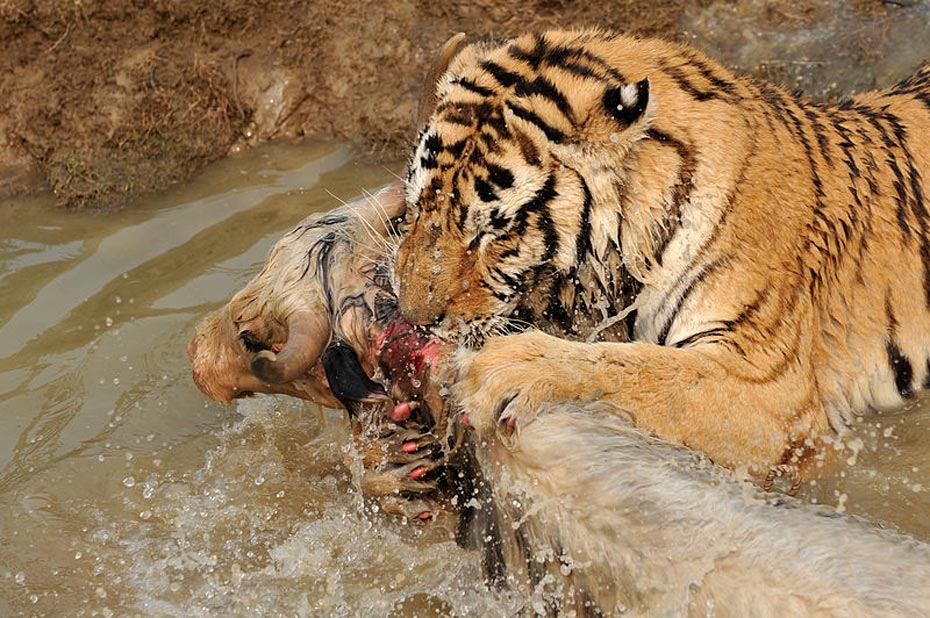 但水中的牦牛一動彈,更加激發了老虎的野性,這時有三、四只老虎撲了上來,工作人員拼命往水塘邊上拽牦牛,無奈一只虎王一下就咬住了牦牛的脖子怎么都不肯松口,繼而上演了人和老虎的“拔河比賽”。
