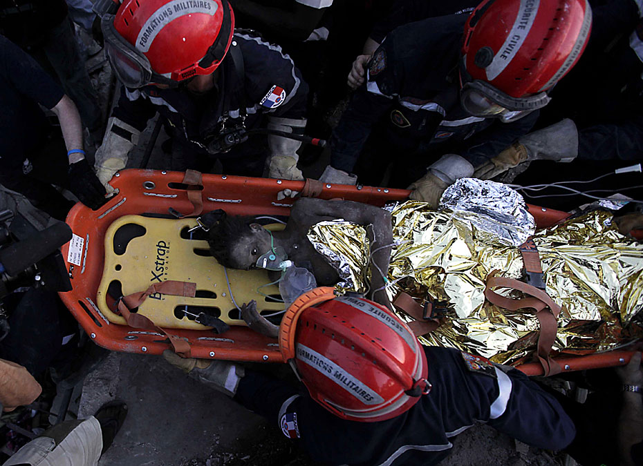 2010年1月27日,海地太子港,法國救援人員在一棟房屋的廢墟下救出被困15天的16歲女孩黛琳娜·艾提尼(Daline Etienne)。女孩微弱的話語讓大家著實吃驚:她竟是憑著隨身的可樂挺了過來。圖片來源:中國新聞網