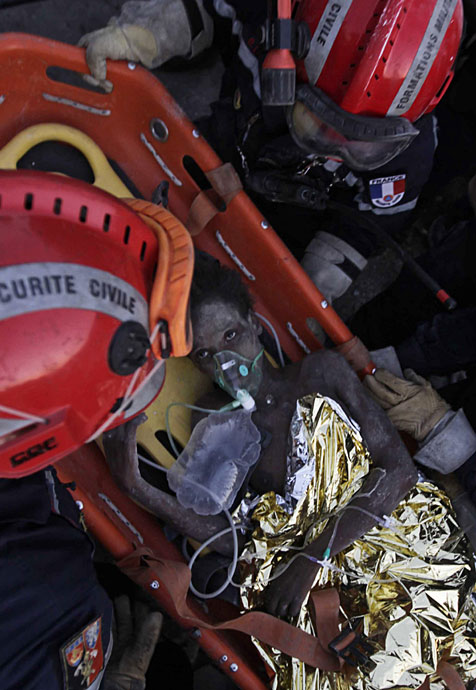 2010年1月27日,海地太子港,法國救援人員在一棟房屋的廢墟下救出被困15天的16歲女孩黛琳娜·艾提尼(Daline Etienne)。女孩微弱的話語讓大家著實吃驚:她竟是憑著隨身的可樂挺了過來。圖片來源:中國新聞網