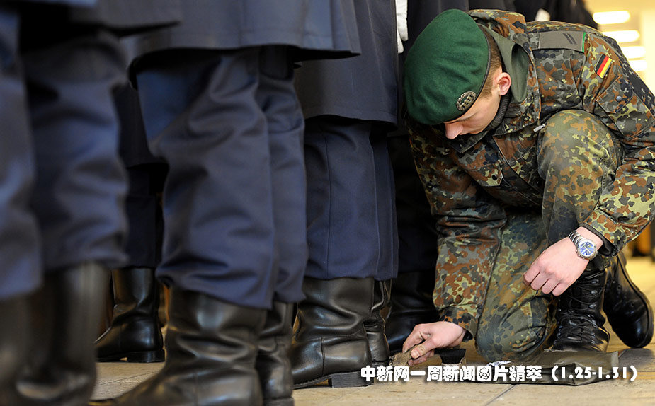 1月25日(周一),在柏林機場,為迎接以色列總統(tǒng)佩雷斯的到來。一名士兵正為儀仗隊士兵的皮靴上鞋油。圖片來源:中國新聞網(wǎng)
