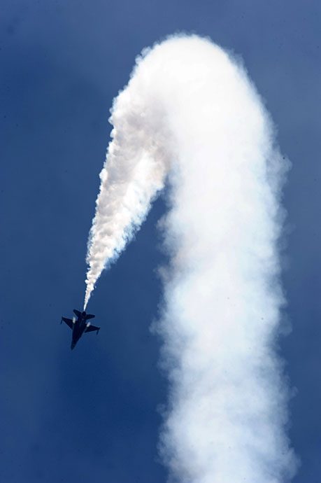 圖為美國F-16戰機在進行飛行表演。