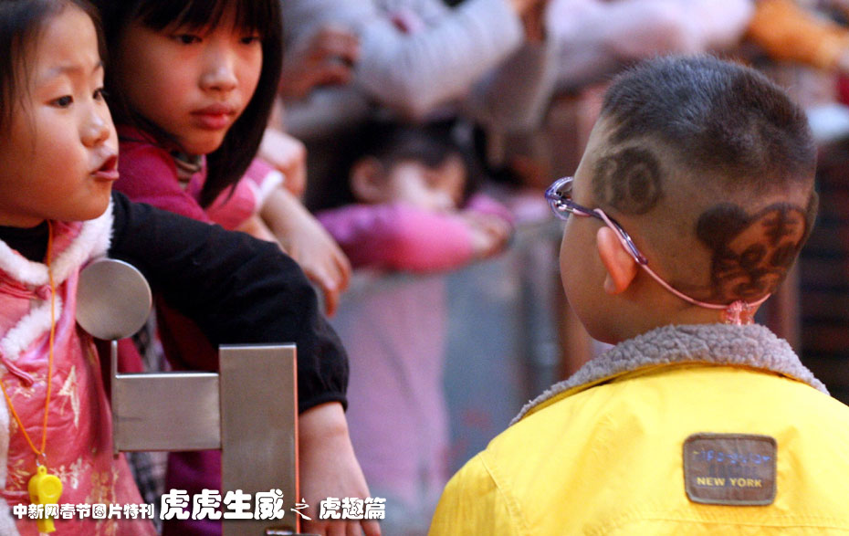 中國傳統新年虎年將至,北京隨處可見以虎為主題的各種雕塑、繪畫以及裝飾、禮品。圖為近日北京一名小朋友以最新潮的“小老虎頭”亮相顯得別具新意。中新社發 錢興強 攝