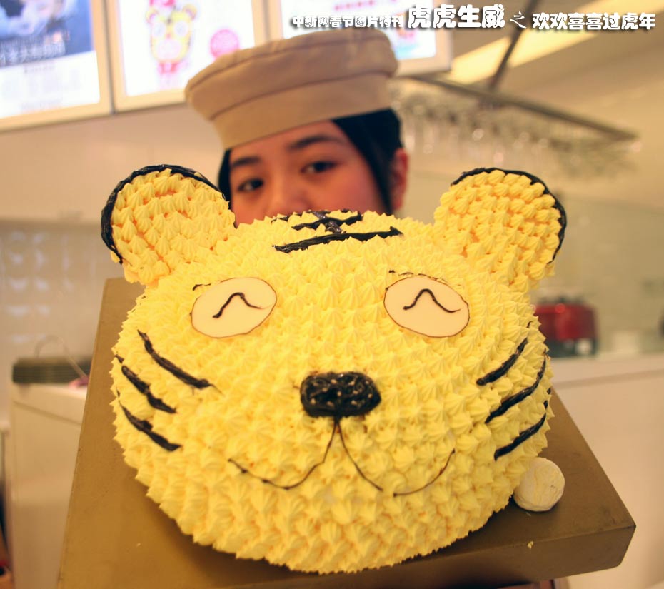 2月4日,浙江臺州市蛋糕店的點心師展示卡通虎臉蛋糕。中新社發 王天榮 攝