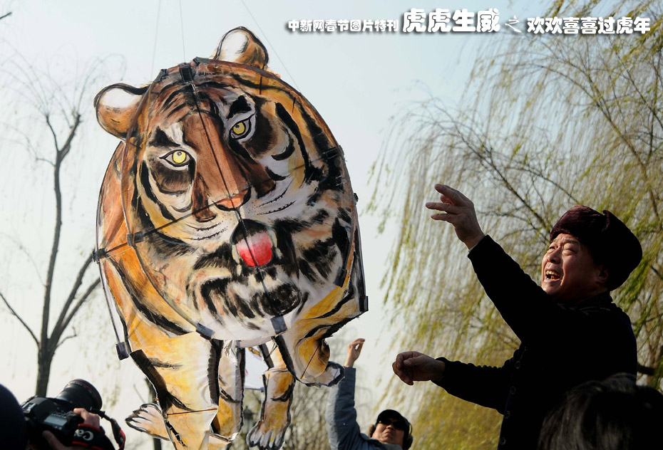 2009年12月31日,數位風箏協會的主席、理事帶著他們制作的“猛虎下山”、“虎虎生威”等迎新風箏來到杭州西湖白堤景區放飛,預祝協會和杭州市民來年紅紅火火。 中新社發 引煒 攝