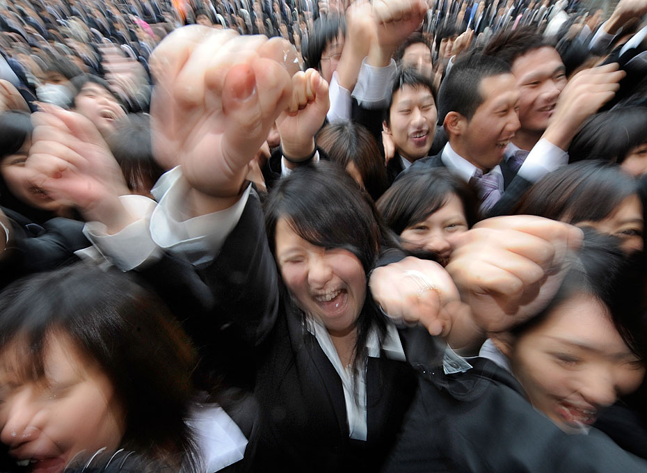 2月10日,日本東京職業學校的學生在求職動員會上伸出拳頭展現信心。日本的失業率達5%,2011屆畢業生將面臨嚴峻就業形式。圖片來源:中國新聞網