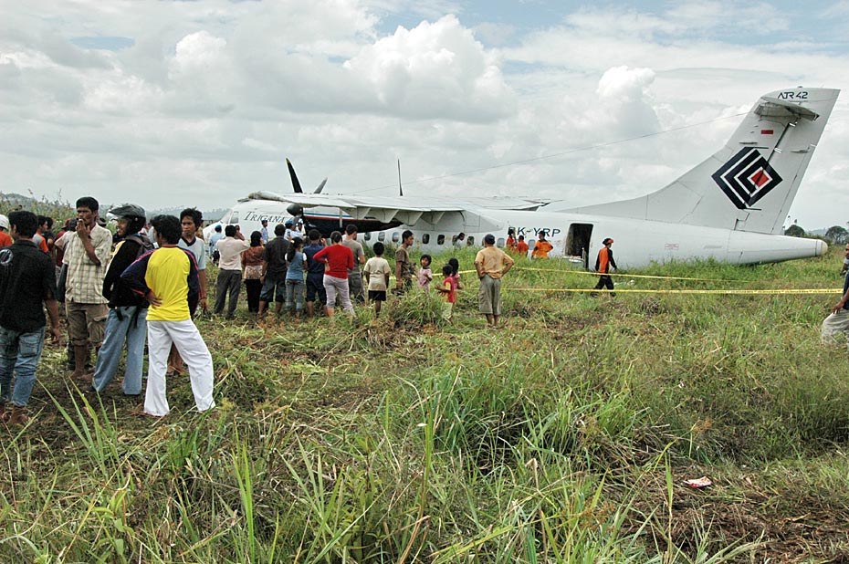 印尼當地時間2月11日,印尼一架客機成功迫降婆羅洲島的一片稻田,機上47名乘客和5名機組人員除兩人腿部骨折外,其他人均安然無恙。圖片來源:中國新聞網