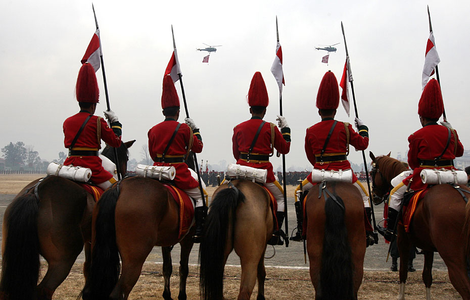 當地時間2月12日,尼泊爾士兵在首都加德滿都舉行了建軍節閱兵式。尼泊爾總統和總參謀長檢閱了受閱部隊。圖片來源:中國新聞網