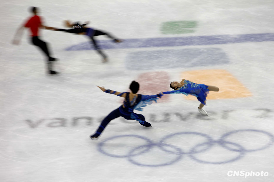 當地時間2月13日,中國花樣滑冰隊龐清/佟健、張丹/張昊在溫哥華太平洋體育館,利用最后的休息時間重復練習積極備戰即將到來的比賽。中新社記者 盛佳鵬 攝