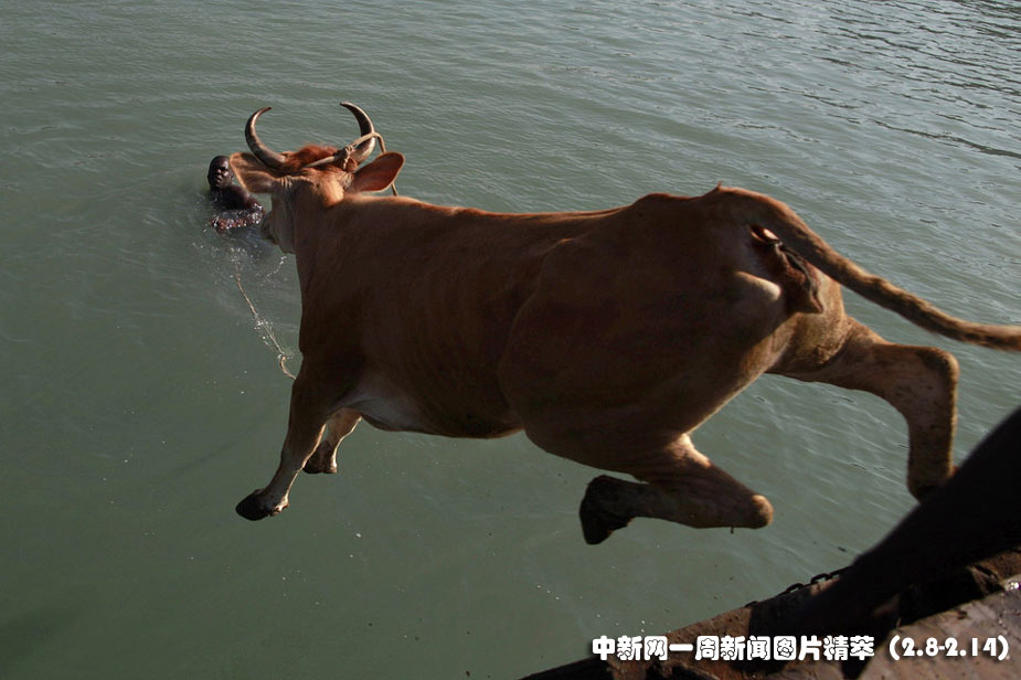 周三(10日)在海地太子港,一只水牛從船上縱身跳入水中,它的主人在水里抓著它的韁繩。