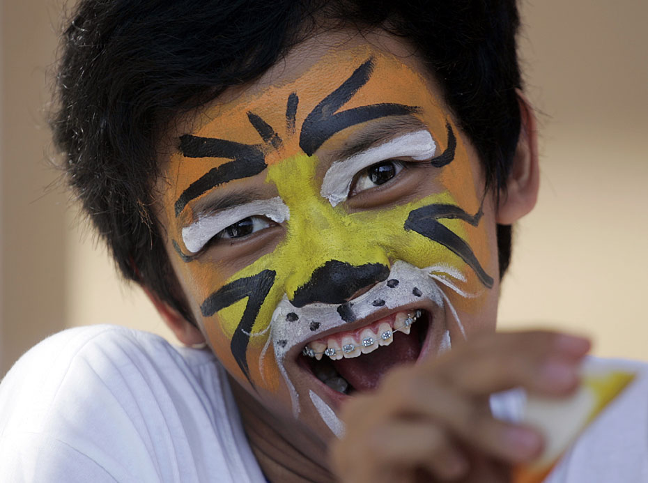 2月20日,馬來西亞民眾圍聚在首都吉隆坡附近的佛光山東禪寺,紛紛將自己繪成老虎的樣子,呼吁大家保護野生虎。圖片來源:中國新聞網