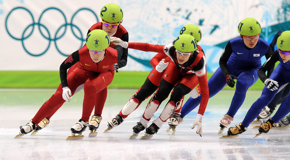 當?shù)貢r間2月24日,溫哥華冬奧會女子短道速滑3000米接力A組決賽中,中國隊王濛、周洋、孫琳琳、張會四朵金花聯(lián)袂出擊,最終將金牌歸入中國隊囊中。圖片來源:中國新聞網(wǎng)
