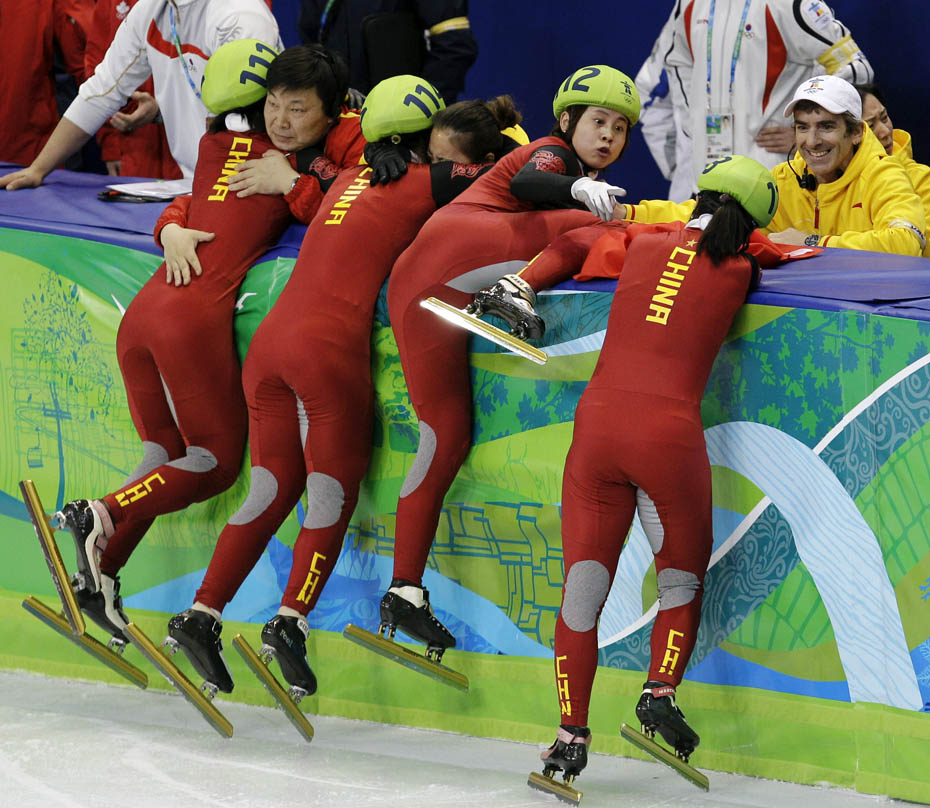 當(dāng)?shù)貢r間2月24日,溫哥華冬奧會女子短道速滑3000米接力A組決賽中,中國隊王濛、周洋、孫琳琳、張會四朵金花聯(lián)袂出擊,最終將金牌歸入中國隊囊中。圖片來源:中國新聞網(wǎng)
