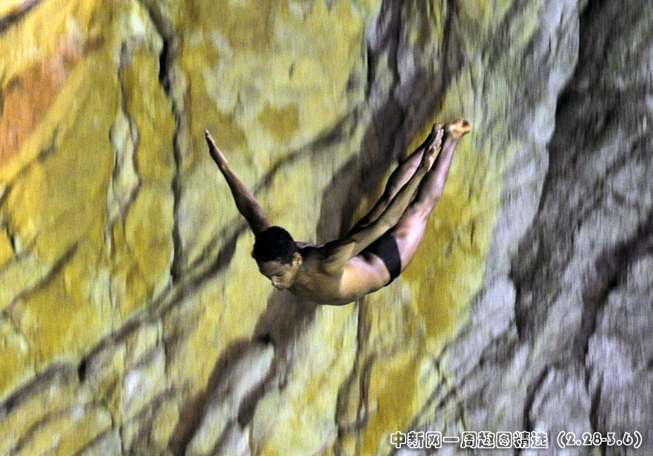 3月1日,墨西哥一名懸崖跳水愛好者手持火把,在該國南部城市阿卡普爾科的“拉·奎布拉達”懸崖上跳水。此種傳統可追溯至1934年。當時,住在阿卡普爾科市的兩位鄰居相互“挑戰”,通過從懸崖上跳向海中來比試各自的勇氣和力量。圖片來源:中國新聞網>>點擊觀看詳細內容