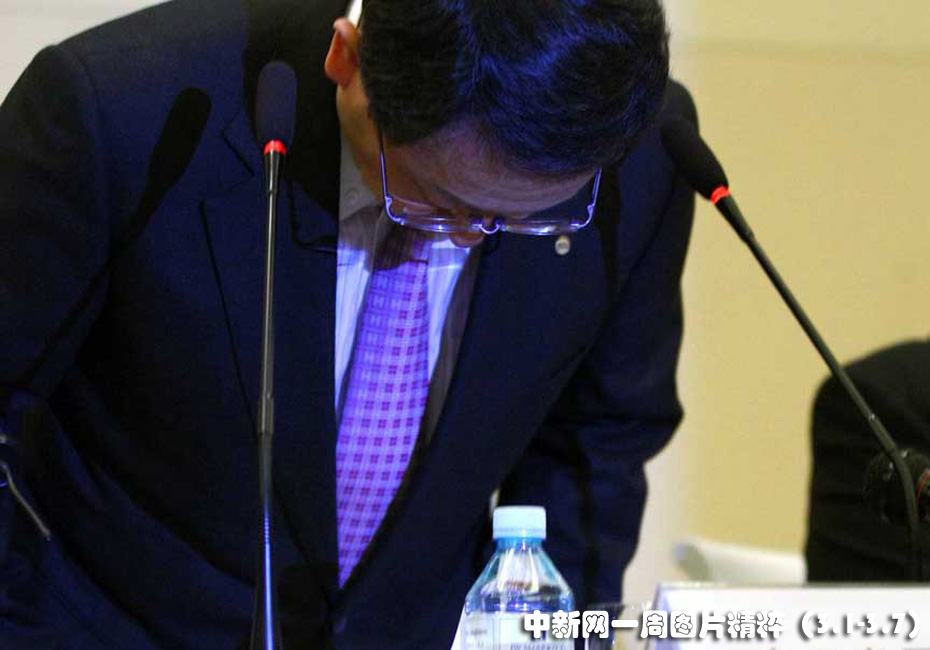 3月1日,豐田汽車總裁豐田章男今日在北京舉行記者會,介紹了豐田汽車大規模召回的原因及處理措施,并向中國消費者鞠躬道歉。圖片來源:中國新聞網