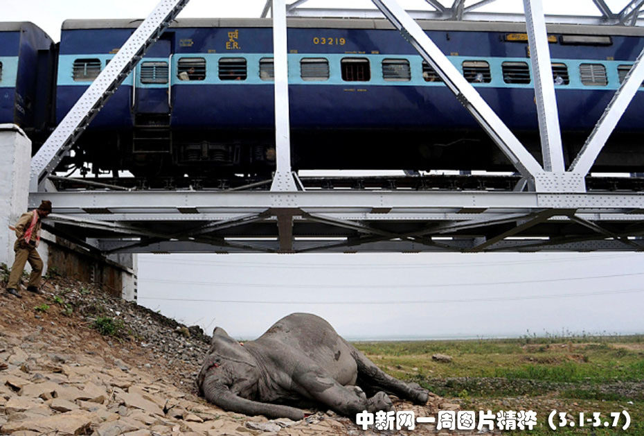 近日,印度高哈蒂的地坡湖野生動物保護區,一名警察正在查看一頭被火車撞死的大象。另有一頭懷孕大象生下一頭小象后帶著重傷逃離現場。工作人員救了這頭小象。圖片來源:中國新聞網